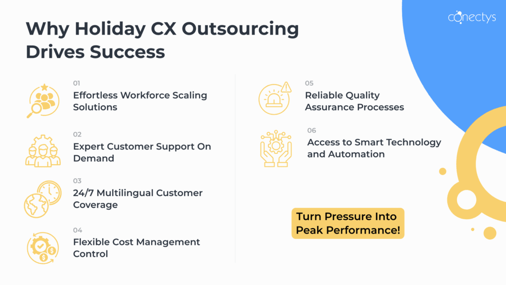 Holiday customer service outsourcing is the practice of partnering with a BPO to manage CX during peak season. Specifically, it ensures that businesses can handle sudden surges in queries, orders, and complaints without overloading in-house teams. Moreover, outsourcing provides scalable seasonal staffing solutions, multilingual coverage, and specialised expertise, thereby turning holiday chaos into smooth, reliable service. Ultimately, it enables companies to maintain consistent quality while controlling costs and operational complexity.