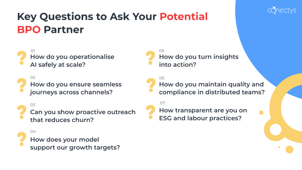 If partnering is part of the CX strategy, vendor selection should move beyond seat counts and hourly rates to a richer set of criteria. Technology stack and innovation roadmap, industry expertise, scalability, and cultural fit all influence whether a relationship will genuinely move the needle. C‑suite and procurement teams should probe providers’ plans for AI and automation, vertical specialisation (e.g., fintech or travel), and their track record of scaling or pivoting operations quickly.