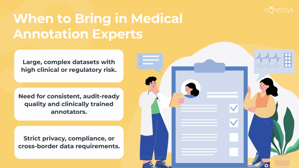 Specialist healthcare data annotation providers (such as Conectys) bring structured processes that most internal teams lack. They supply trained annotators (often clinicians, nurses, coders, or medically trained technicians), formal guidelines, inter‑annotator agreement metrics, and multi‑step QA workflows designed for clinical data rather than consumer images or text. That discipline is what turns “we labelled some scans” into evidence you can show to your clinical governance board, your CRO, or a regulator.