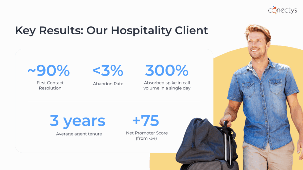 Case in point: one of our long-term clients at Conectys, a global leader in broadband and interactive tech for high-end hotels, needed a smarter way to support guests across 4- and 5-star properties worldwide.